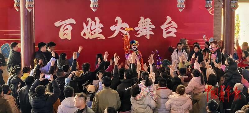 2月20日晚,辽宁朝阳,2026年辽宁朝阳迎春灯会现场,演员扮成小丑与观众互动。中青报·中青网记者 李建泉/摄