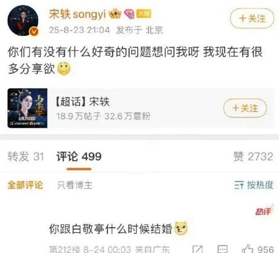 去年8月,宋轶发文问粉丝有没有想问的,热评上明晃晃几个大字:你什么时候和白敬亭结婚?