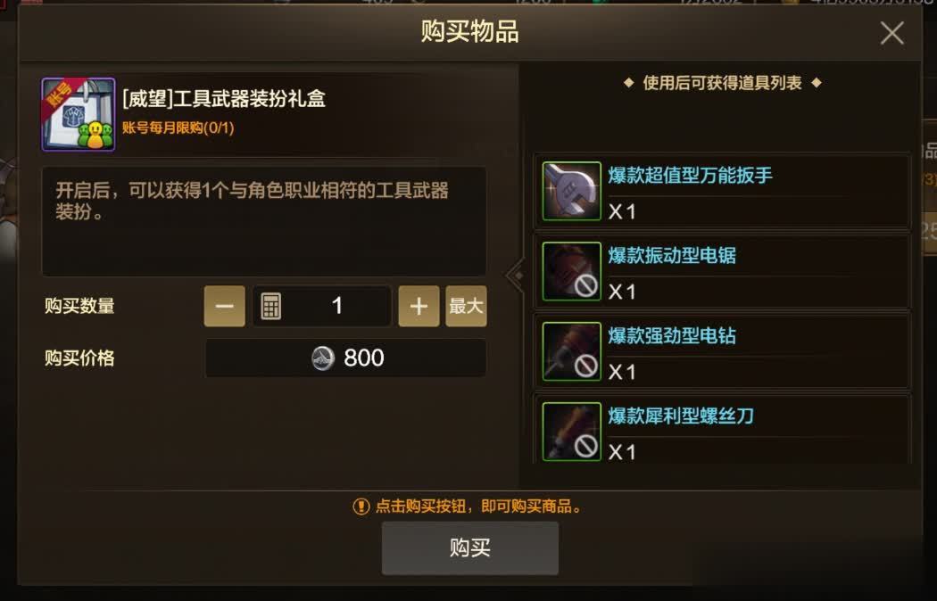 威望币获取途径多样,带其他玩家刷图打团能收获不少,不少玩家可能积攒了不少威望币却忘记兑换。威望商店可兑换的道具材料丰富,重点是威望武器装扮,威望系统下线后它将绝版。现在大家能免费兑换这件绝版武器装扮,本月可兑换一件,下个月更新前还能再换一件给小号。很多玩家错过这个福利,这次可别忘领。这武器装扮外观个性十足,鬼剑士拿着扳手,搭配天五超帅。