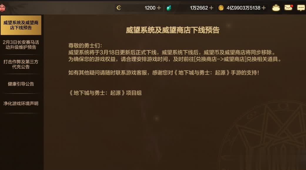 不少玩家或许没留意到这个下线预告,因其不像更新通知那般醒目,而是置于活动列表,稍不留意极易错过。从策划的紧急提醒可知,威望系统将于3月18号下线,届时威望币和兑换商店都将删除,所以策划提醒大家,有威望币的尽快兑换,否则下线后损失不小。值得注意的是,威望系统的下线时间与一些主播预测的80版本更新时间相符,不出意外,新版本应在此时更新。