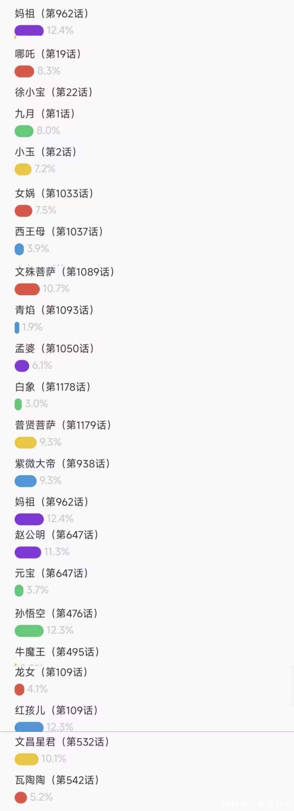 第六名到第九名,分别是文昌帝君、普贤菩萨、紫微大帝和哪吒,其中文昌帝君的投票占比是10.1%,文殊菩萨和紫微大帝都是9.3%,哪吒今年动力不足,目前只有8.3%,已经处于第九的位置五六天了。