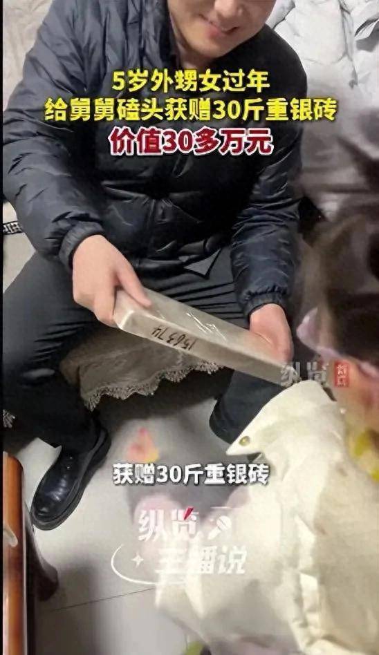 2月21日(采访时间),山东临沂,邵女士在社交平台发布视频称,年夜饭后,哥哥喝了点酒,将车上一块重达30斤、价值30多万元的银砖搬下,称外甥女给自己磕头就把银砖送她,5岁外甥女立刻磕头并送上祝福,舅舅当场兑现承诺。